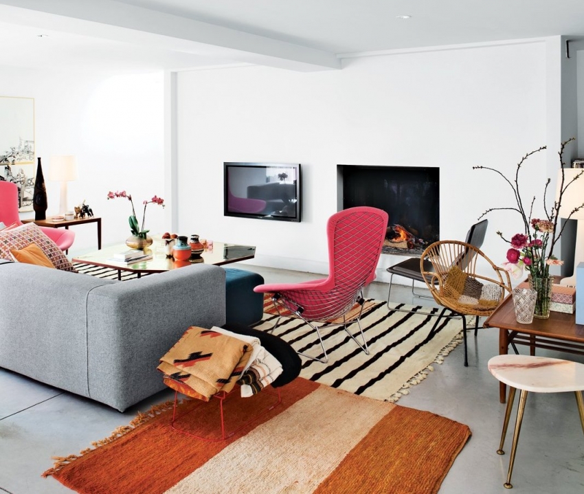 Обыграть скупость минималистического камина в интерьере, который кажется просто вырубленным в стене и лишенным всяческой отделки, можно, дополнив пространство идентичной по геометрии мебелью. Скупость же форм в целом компенсируется игрой светотеней и цвета.