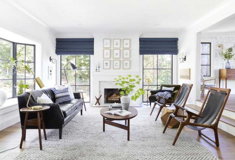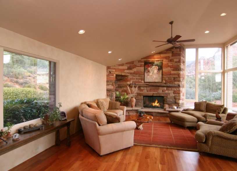 В центре обязательно должен находиться камин, а напротив можно поставить кофейный или журнальный столик.