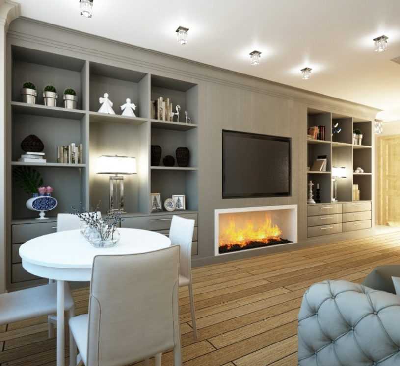 Встроенный во внутреннюю стену современный камин на биологическом топливе позволит в вечернее время наслаждаться великолепным панорамным видом из окна и нежной игрой языков пламени. Предметы мебели при этом располагают вдоль внешней стены помещения.