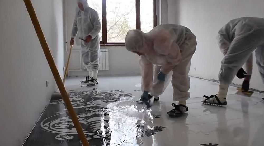 Примерно, необходимое количество базового состава выливается полосами на основу, а затем с помощью ракли или шпателя смесь следует равномерно распределить по всей поверхности.
