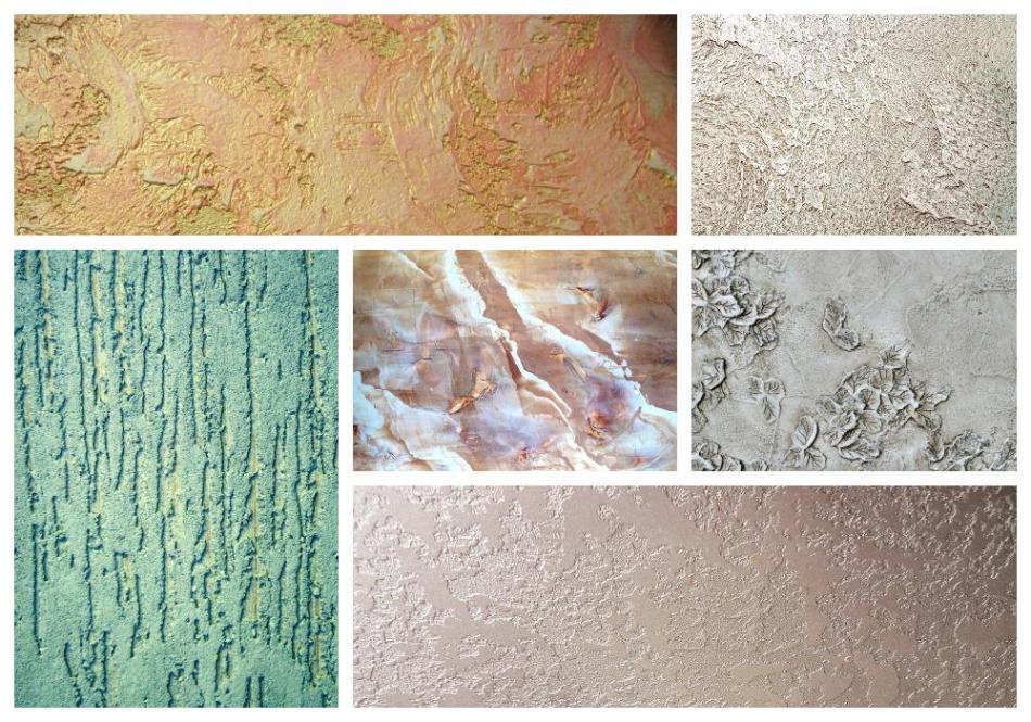 Рельефные. При нанесении материала на плоскость подвергаемою декорированию, мастер формирует неоднородную и разнообразную рельефную поверхность. К достоинствам метода, можно отнести низкие требования к предварительным работам по созданию основания. Достаточным условием будут его прочностные характеристики без глубоких перепадов, при этом идеально ровной стены не потребуется. Рельефный метод нанесения позволяет воплотить в жизнь все задуманные фантазии.