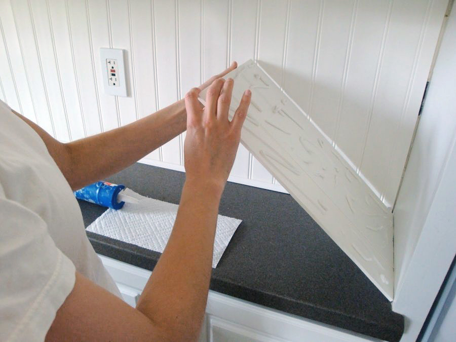 Затем панель измеряется и выпиливается из нее нужная часть. Пилить лучше электролобзиком. Спиленные части устанавливаются к потолку или к полу. Видимая часть должна быть с четким рисунком цельных плиток. Перед установкой на каждую деталь влагостойкой стеновой панели с обратной стороны наносится слой клея толщиной 5 мм. Особенно хорошо клей наносится на края листа. Можно клеить и с применением жидких гвоздей.