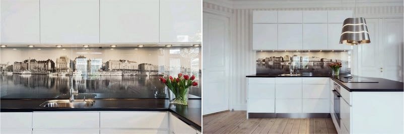 Поскольку изделие из триплекса представляет собой многослойный «бутерброд», рисунок на декоративной плёнке надежно защищен и от влаги, и от ультрафиолетового излучения, поэтому не портится и не выгорает. Стеклянная панель может имитировать фактуру камня, например, мрамора, который всегда выглядит стильно и дорого. Также на фартуке можно увековечить любимую семейную фотографию.