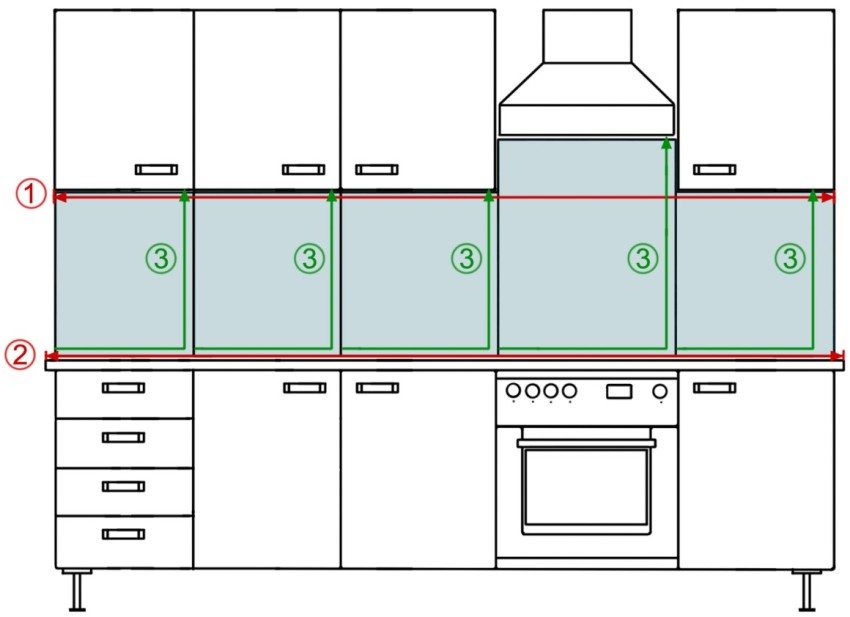 - если вы планируете размещение фартука из плитки над кухонной плитой, то вверх необходимо выложить дополнительные 60-80 см. В ширину также лучше оставить припуски на 10-15 см;