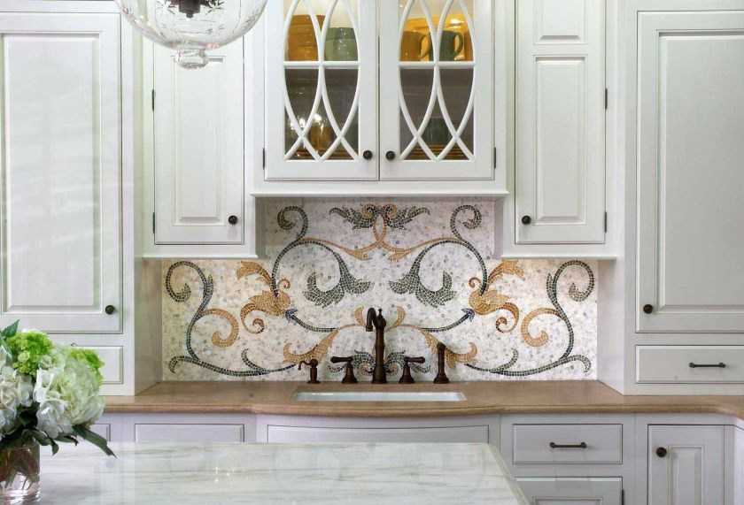 Мозаичная композиция всегда выглядит сложно и изысканно. Ее можно использовать для создания абстрактных узоров, различных рисунков или цветов. Материал таких деталей может быть самым разным, что непременно будет влиять не только на внешний вид фартука, но и на его практические свойства.