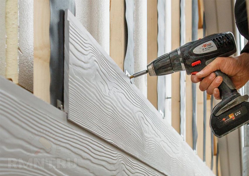 Далее фиброцементный сайдинг крепится внахлест или встык с помощью саморезов. При этом фиксацию досок к обрешетке необходимо производить как минимум в трех точках. Стыки панелей лучше всего располагать в шахматном порядке. Места стыков сайдинга во внешних и вертикальных углах рекомендуется проложить лентой из EPDM резины для лучшей защиты от длительных атмосферных воздействий.