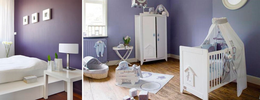 Если фиолетовый цвет дополнить бледно-розовым, светло-синим или сдержанным голубым, получится комната, выполненная в монохромных тонах