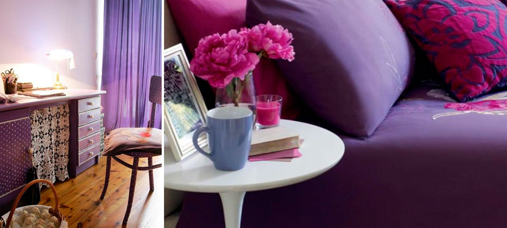 Фиолетовые акценты в помещении помогают развивать творческую фантазию, сосредоточиться на учёбе. Гиперактивных личностей они успокаивают, а пассивных стимулируют. Данный цвет будет уместен в кабинетах творческих людей, которым необходимо постоянное вдохновение.