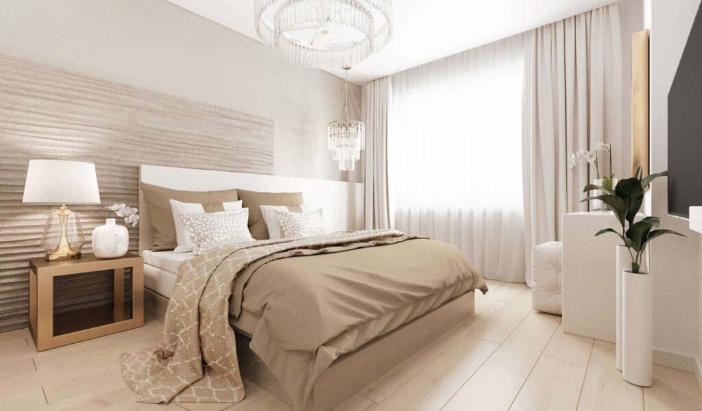 Для нейтральной цветовой гаммы спальни помимо серого, коричневого и белого также можно использовать охру, стальной или зеленый, естественно, не слишком яркий цвет.
