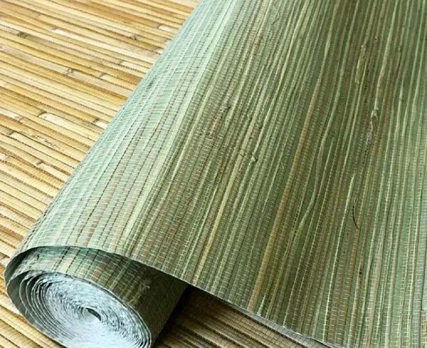 - 3) Удерживают тепло, обеспечивают звукоизоляцию, выделяются прочностью и красотой обои из волокон растений. Могут производиться вручную. Такие стоят дорого. Но в среднем стоимость растительных обоев меняется от 1000 рублей за рулон до 10 000 – 15 000. В магазинах представлены производителями из Китая (Дизайн Тропик, Rodeka), Италии (COSCA D’ECOLINGI) и других стран.