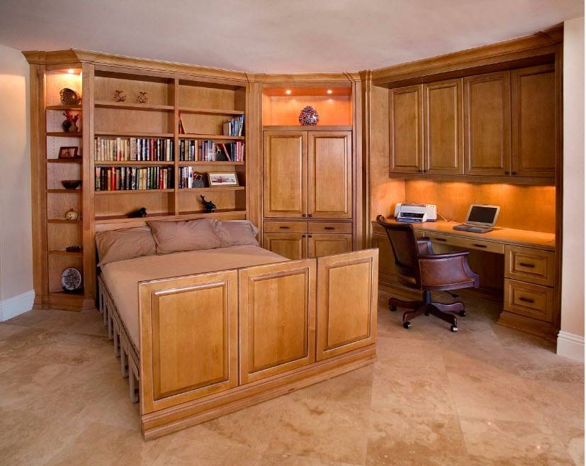 Мастера делают разные по размеру шкафы, чтобы в них было легко прятать как одежду, так и прочие предметы. В гостиной можно поставить шкафы купе с плечиками, стальными перекладинами и ящиками. Если внутри него много пространства, то можно поставить видео-зону или письменный стол.