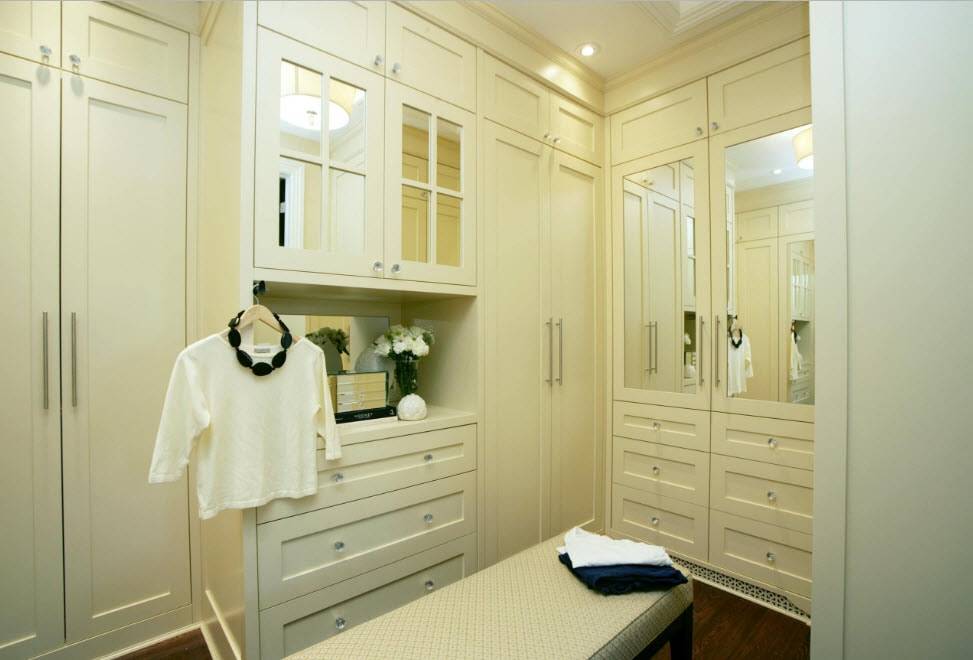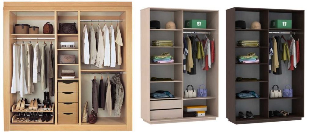 Расстановки внутренних деталей может быть разнообразной. Главное, чтобы мебель была функциональной, а наполнение шкафов купе удобным в использовании.