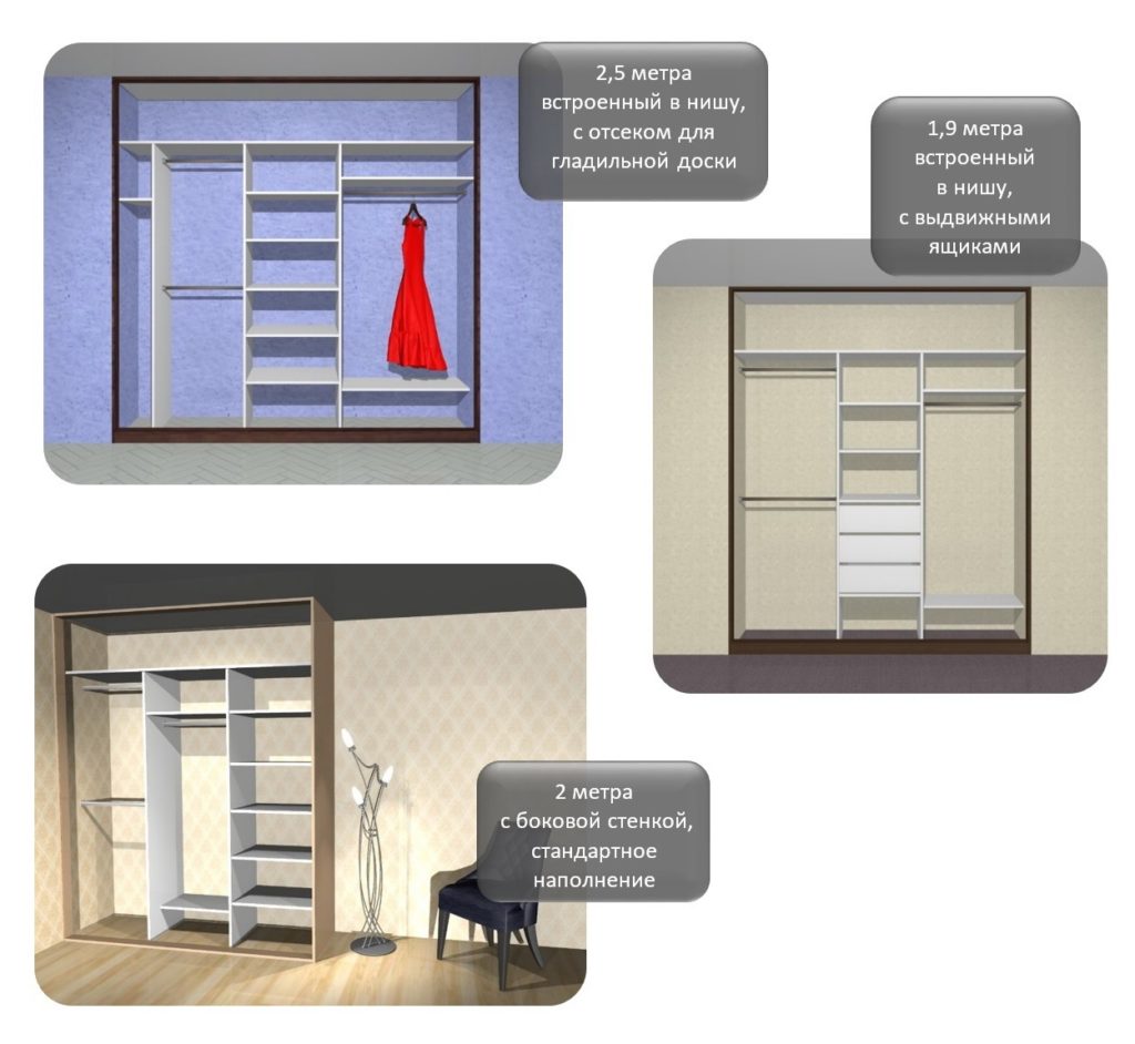 Наполнение встроенного шкафа-купе может отличаться только направленностью штанги для подвесных вещей (глубина меньше ширины плечиков) и рабочей глубиной полок и ящиков.