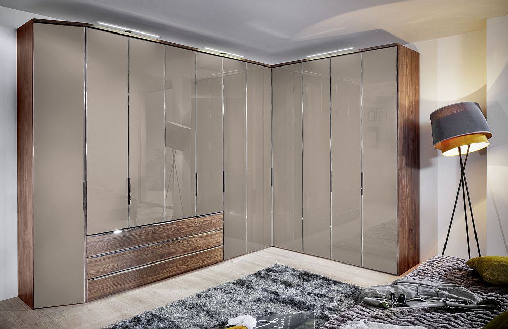 Угловой шкаф-купе в спальной часто оснащается подсветкой. А если это угловая гардеробная комната, то монтируется в ней полноценное освещение.