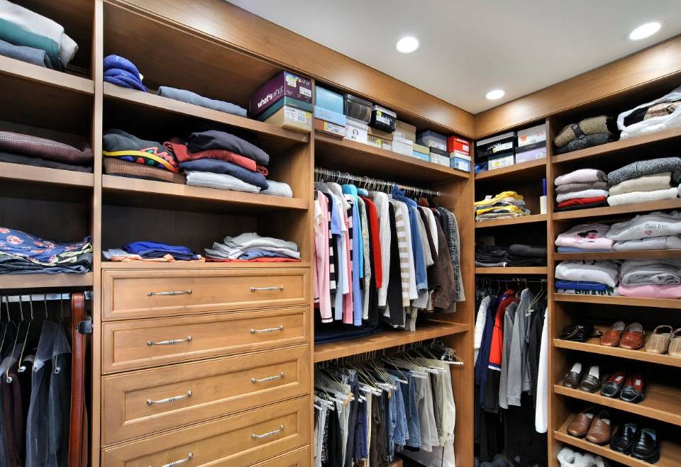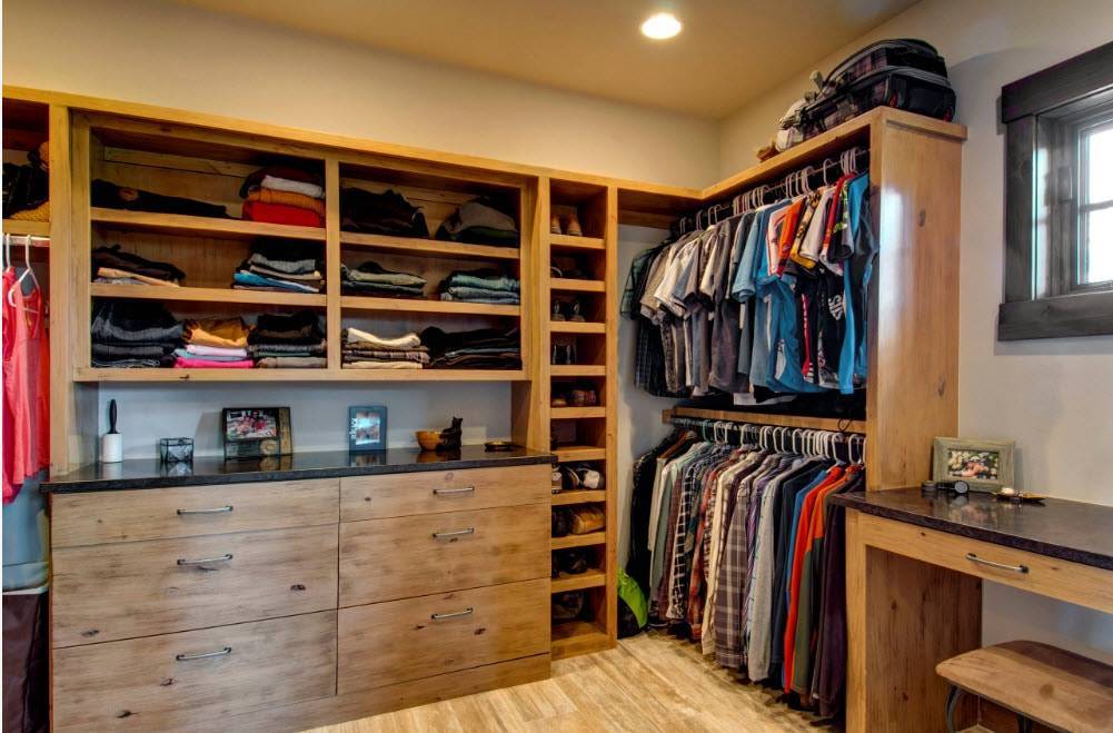 Исходя из этого пространство зонируется так: одно большое отделение с перекладиной, 2 ряда полок или ряд полок посередине и 2 большие секции по бокам. Можно использовать одно отделение со штангой для хранения одежды во весь рост, другое – для пиджаков, рубашек. Это дает возможность применения части пространства для других нужд.
