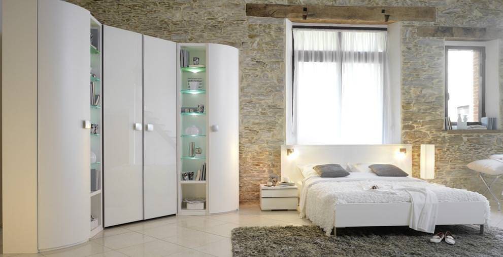 Эксперименты с функциональностью и компактностью угловых шкафов привели к созданию радиусных моделей. Главная особенность таких предметов мебели – закругленные фасады, которые подразделяются на 3 типа: