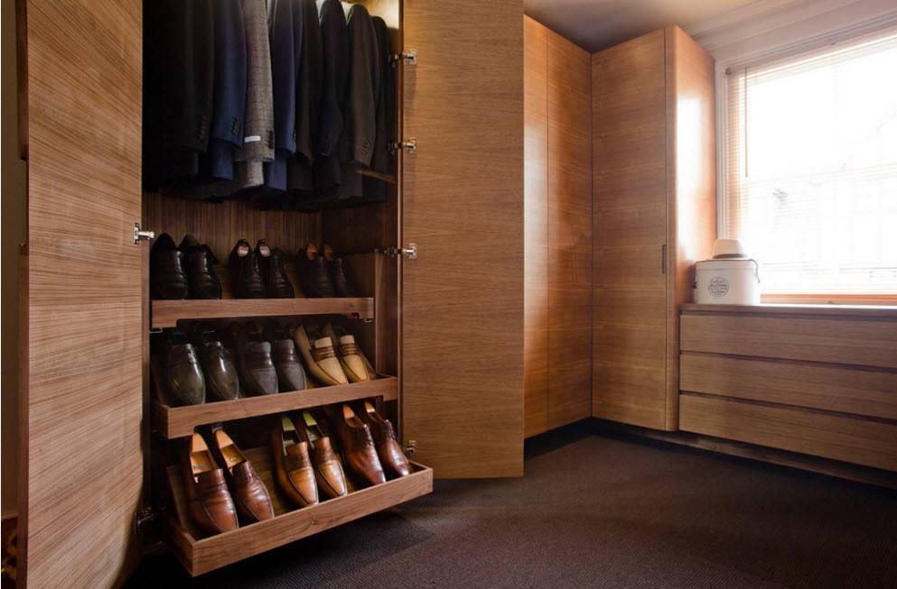 Отличный способ использовать глубокие угловые ниши. Да и просто компактно хранить пару десятков туфель. Вы можете легко осмотреть имеющиеся запасы и выбрать подходящую модель для утреннего или вечернего наряда.