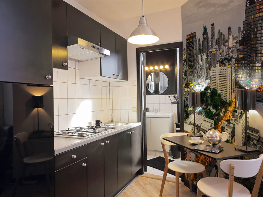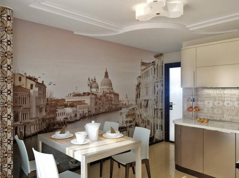Зрительно увеличить комнату помогут фотообои, на которых изображено продолжение помещения. Это может быть широкий балкон, терраса или длинный коридор, распахнутое окно с видом на море, и так далее. В таком случае кухня сразу же приобретает более широкие границы.