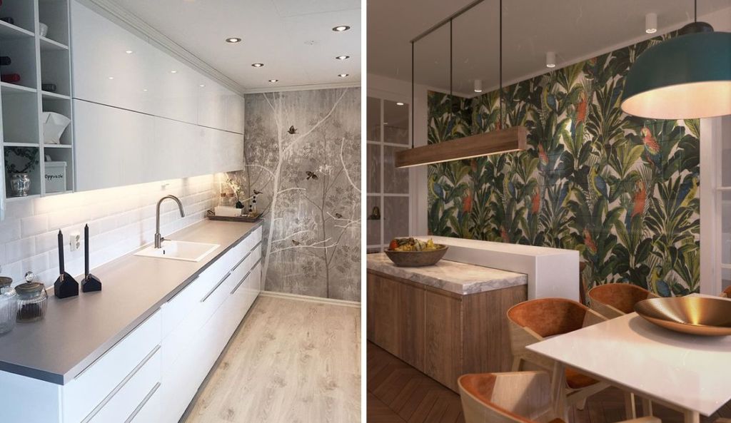 Обои с фотопечатью отличаются тем, что на них можно нанести абсолютно любой рисунок, вплоть до личных фотографий. Тип основания бывает разным, поэтому их можно использовать и на кухне. Но чаще всего это акцентный элемент, а не полноценное покрытие для всех стен.