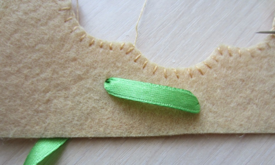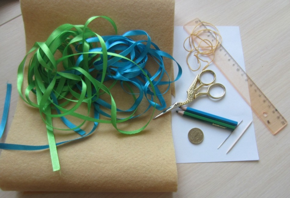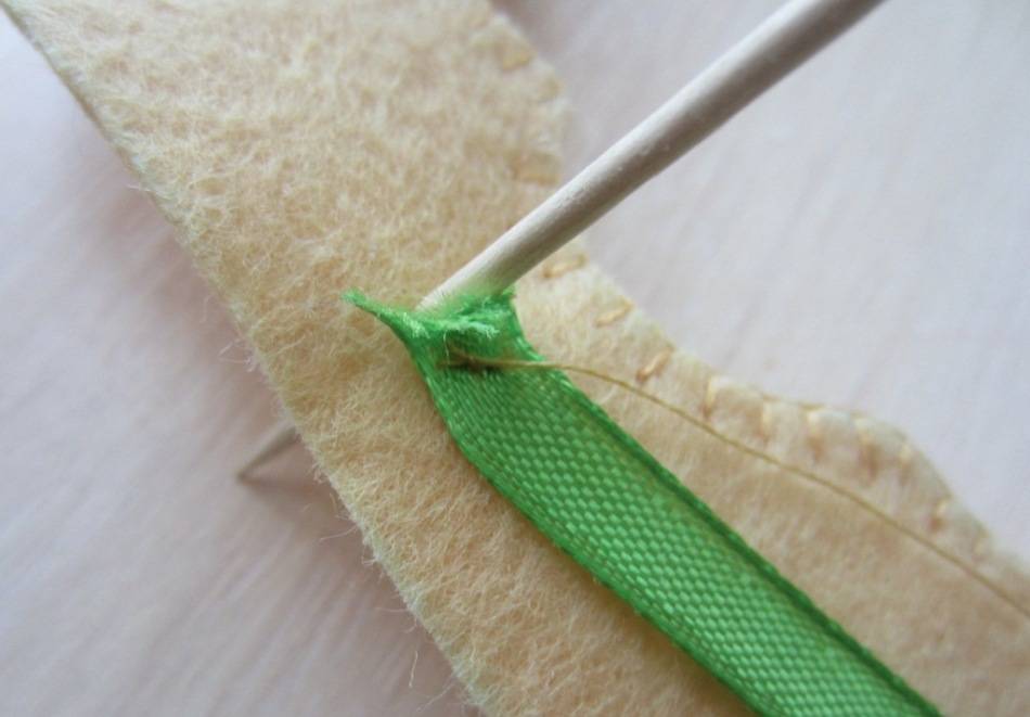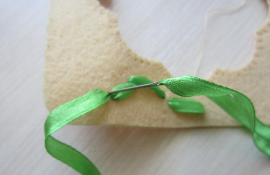 Самое время заняться вышивкой лентами! От зелёной следует отрезать около 50 см, вставив её в иголку с широким ушком.