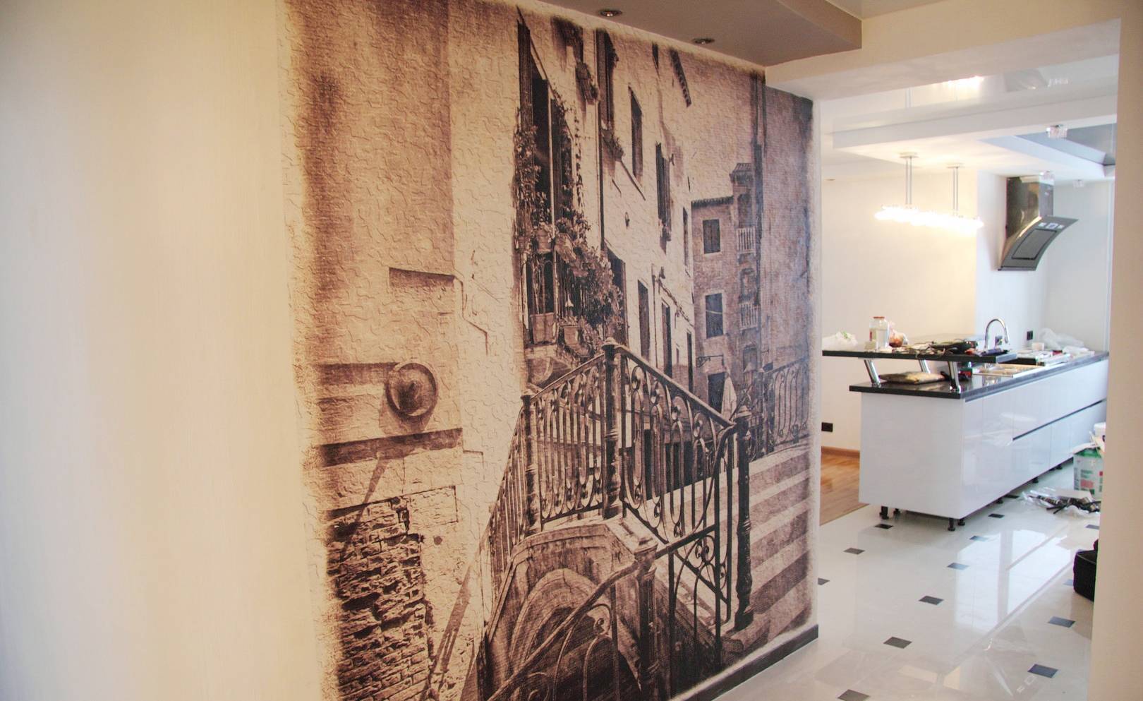 Так, самым простым вариантом, который используется, как правило, при оформлении небольших квартир, являются фрески-обои, или, точнее, фотообои, дизайн которых выполнен в духе старинной росписи, своеобразные картины на стене. Такие обои можно использовать не только на стене или потолке, но и украсить ими, например, шкаф-купе в прихожей, встроенную мебель для кухни. Современная технология изготовления таких фресок предусматривает использование цифровой печати, и позволяет создавать обои самого оригинального вида, открывает возможность создать даже самый безумный дизайн: на фотообои можно перенести любые понравившиеся варианты пейзажей — виды природы, города, портреты, цветы, картины известных художников… Стоит отметить, что, помимо обычных фресок-обоев, существуют специальные влагостойкие фотообои, которыми можно декорировать, например, участки кухни, детской, прихожей, или другие части квартир, которые могут быть подвержены воздействию влаги, включая стену ванной, душевую комнату.