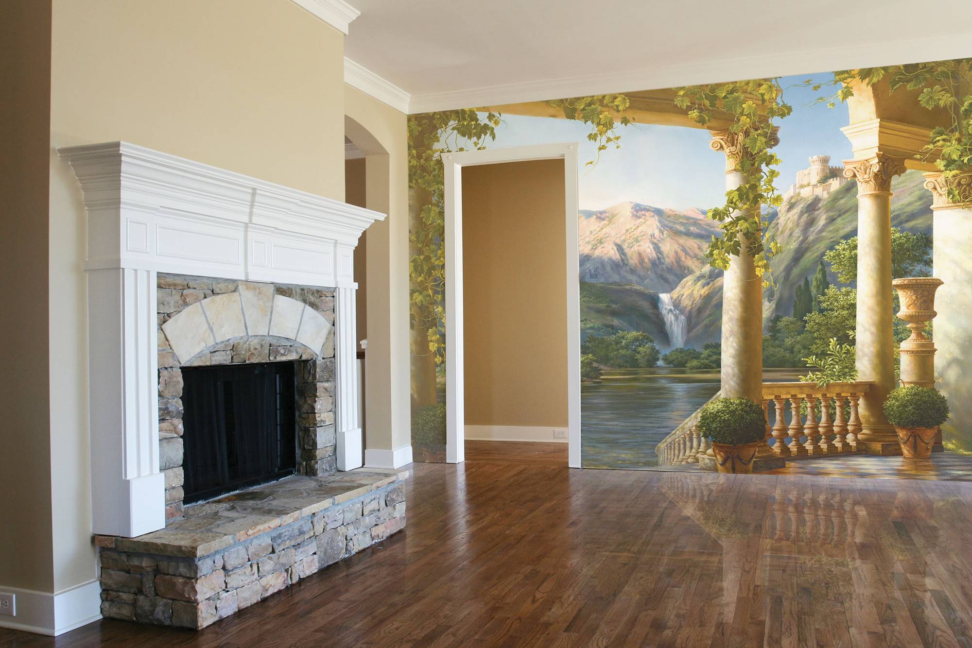 На фото фреска на основе штукатурки в пастельных оттенках с изображением природного ансамбля замка выглядит ненавязчиво и нежно в светлом классическом интерьере.