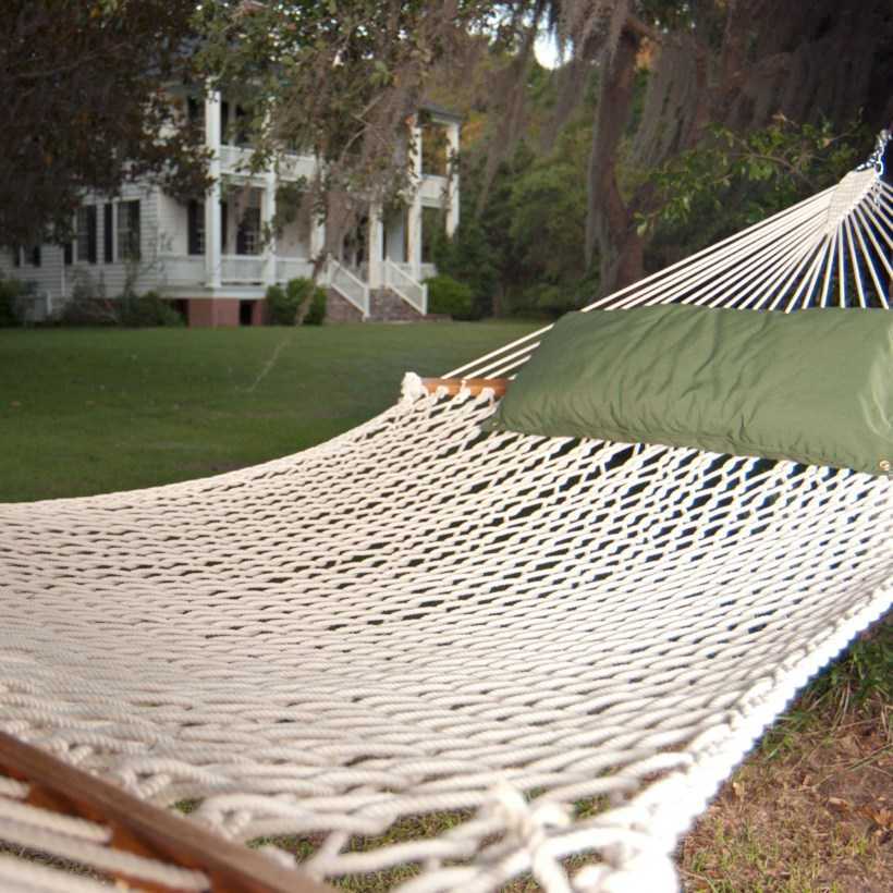 Хлопковые шнуры экологически чистые и мягкие, приятны к телу. Такая основа для плетеного изделия отлично держит узлы. Недостатком материала является его недолговечность и боязнь непогоды — хлопок быстро портится в дождь. Такие веревки делают гамак неподходящим для уличного использования.