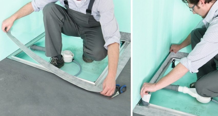 Затем уделяется внимание стыкам между стеной и полом. В этих местах лучше дополнительно использовать специальную герметичную ленту.