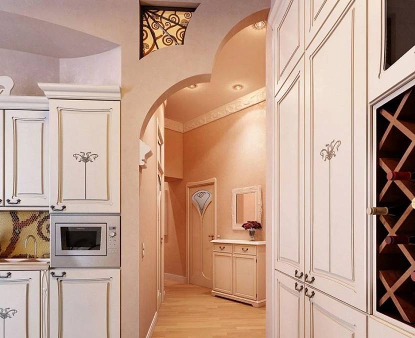 Для кухни и коридора, выполненных в единой стилистике, арочный проем, станет особенно отличным вариантом, который позволит объединить два помещения, не только визуально, но и физически. Такой декораторский прием полностью изменит интерьерное восприятие и сформирует более гармоничную атмосферу.