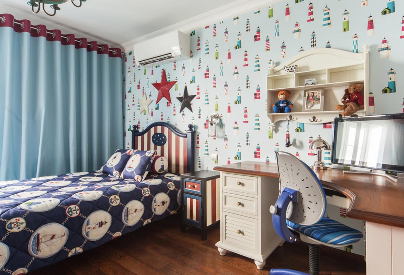Обязательно для морской тематики наличие белого. Это освежает детскую, делает ее светлее и ярче. Особенно красиво выглядит мебель белого цвета на фоне серого с голубым.