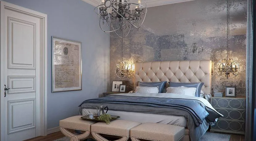 Голубой цвет в интерьере спальни часто используют вместе с серым