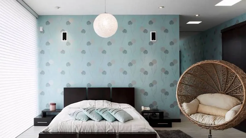 Бирюзовые обои с рисунком в спальне