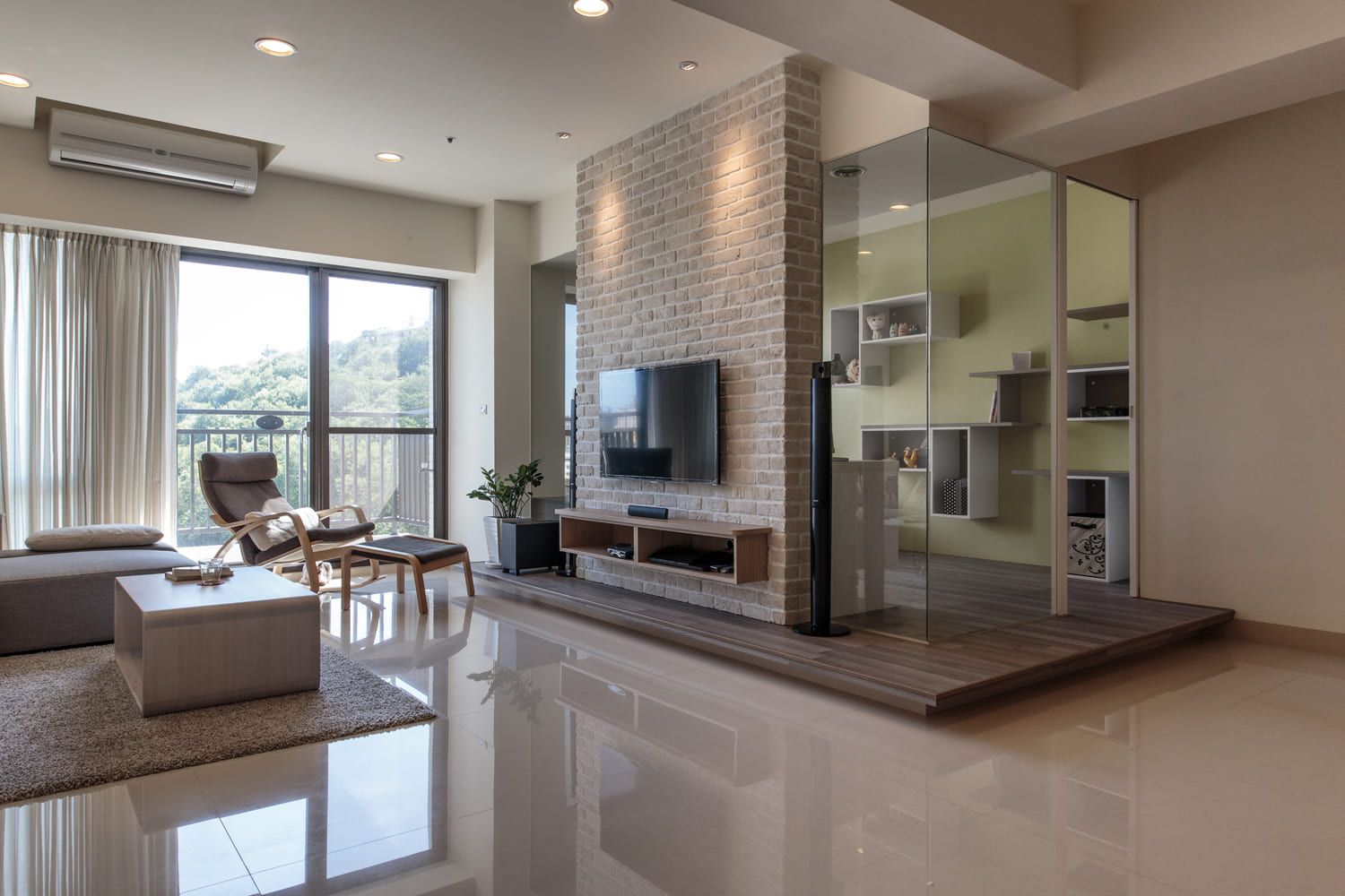 Квартира с большой раздвижной стеклянной перегородкой. Архитектор таким образом разделил личную зону и общую. Если хозяин квартиры захочет, то он оставит перегородку открытой и всё пространство будет соединено в единое целое, в противном случае спальня отделяется. При этом, благодаря стеклу, всегда сохраняется ощущение просторной комнаты.