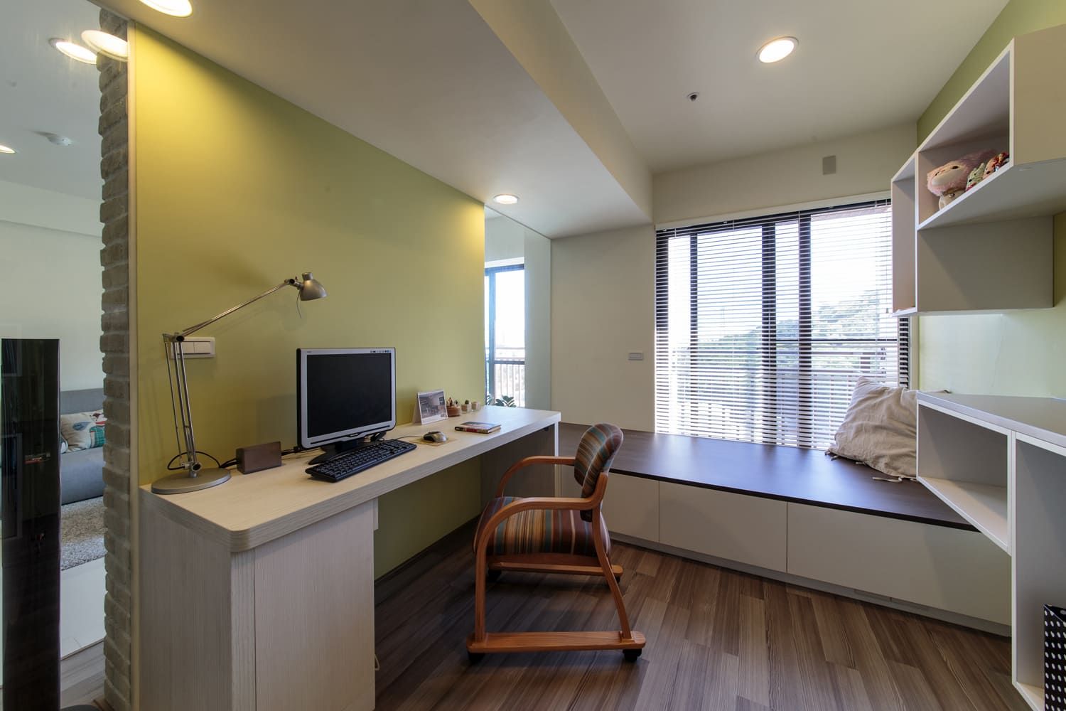 В помещении с перегородками к организации рабочей части комнаты можно подойти иначе. Вполне допустимы не только стол, но и настенные полочки, небольшой стеллаж или тумбочка, но и в данном случае будет уместнее объединить рабочую зону со шкафом. Обособленность мебели для работы в данной зоне нежелательна.