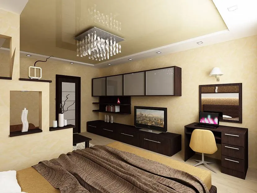 Если возникает необходимость совмещать спальню и гостиную, то для кабинета отдельную комнату выделить не получится. Рабочий стол обычно размещают в спальне. Делать три зоны в помещении 20 м² не стоит (а в меньшем тем более). Значит, нужно обойтись минимумом мебельных элементов.