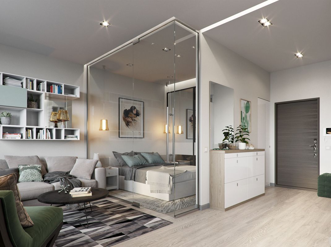 Делание помещения стеклянной перегородкой – довольно популярный приём для современных интерьеров. «Прозрачная стена» позволяет сохранить визуальное единство пространства, но подчеркнуть границы. Чаще всего такие конструкции используются в комбинации со шторами, чтобы имелась возможность изолировать спальное место полностью, при необходимости. Кроме того, стекло обеспечивает звукоизоляцию, хотя и не полную.