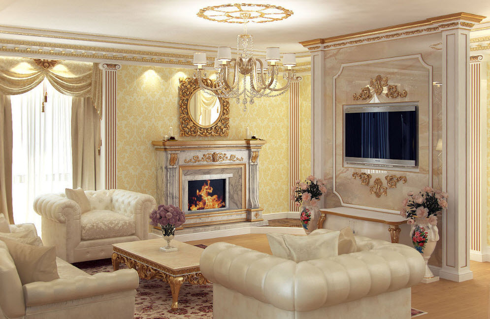 Создание однотонного основания в пастельных тонах. Для отделки используют колоны и лепнину, декоративную штукатурку. Дополнить изысканную атмосферу поможет настоящий дровяной камин.