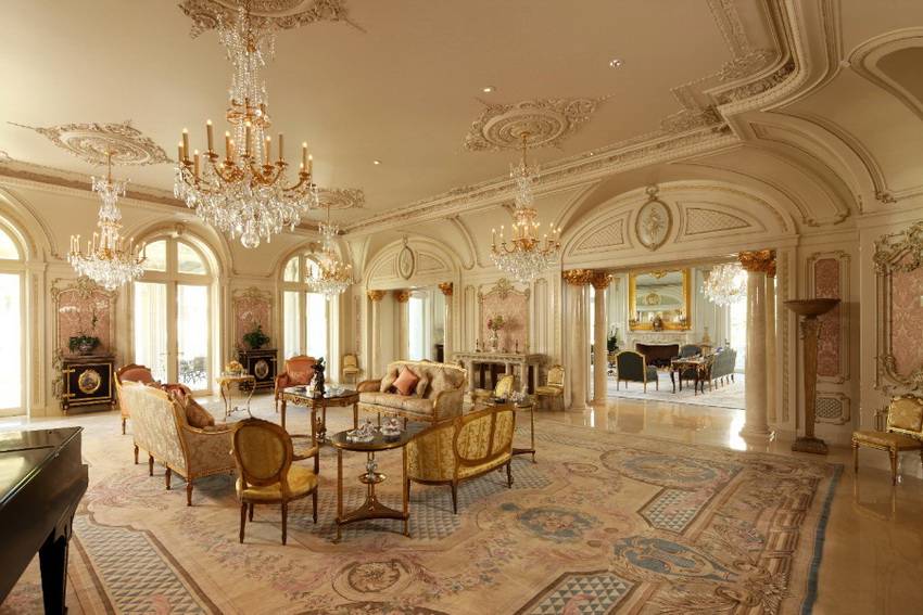 Диваны и кресла в роскошном интерьере не накрывают чехлами и покрывалами. Допустима только обивка, причем дорогими тканями или кожей.