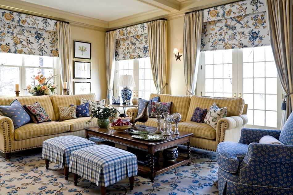 Цвет и рисунок текстиля на мебели и окнах должен перекликаться между собой. Нельзя использовать резкие контрасты. Чтобы поддержать общую тему, из тканей, используемых при пошиве штор, изготавливают диванные подушки или чехлы на них.