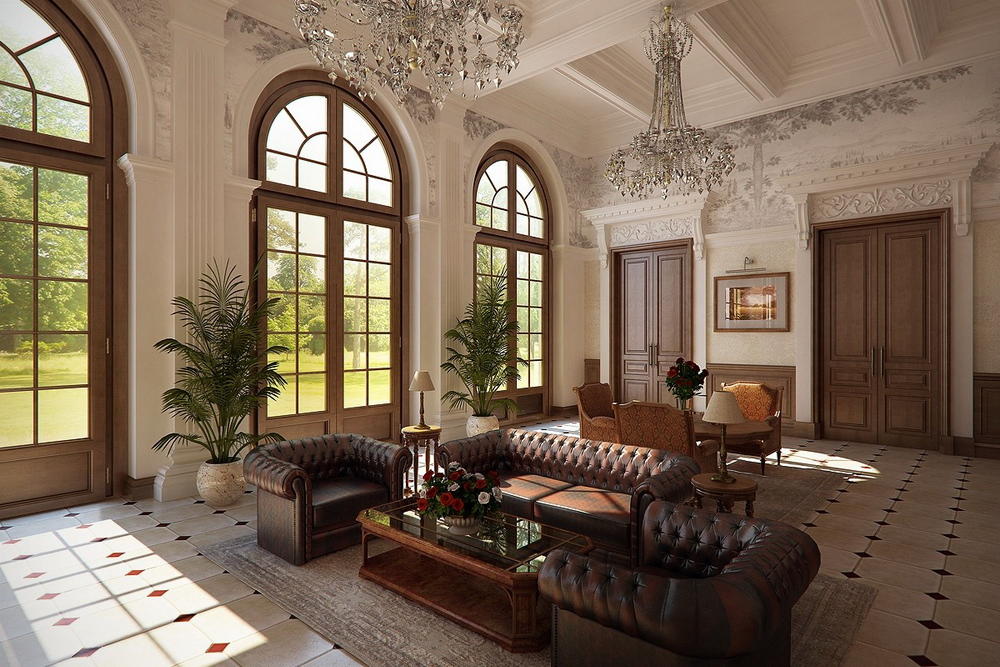Помещение в классическом стиле должно быть хорошо освещено. Это осуществляется благодаря наличию нескольких источников освещения, расположенных по всей площади комнаты. Помещение отделывается исключительно натуральными материалами в виде камня, дерева, благородного металла, что наглядно демонстрируют многочисленные фото интерьеров в классическом стиле. Мебель подбирается массивная, добротная, инкрустированная, дополненная лепниной, позолотой и декоративной резьбой.