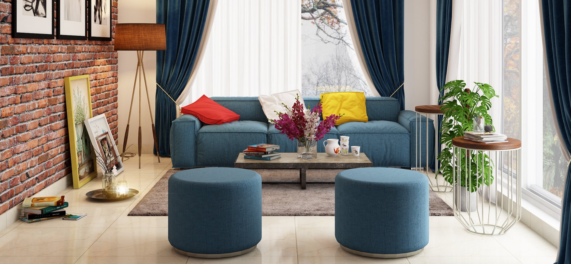Диван с синей обивкой отлично сочетается со шторами в интерьере