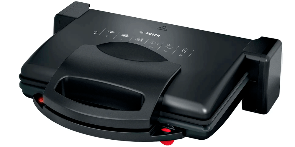 На шестом месте моего ТОПа бюджетный Bosch TFB3323V. Эта модель оборудована съёмными алюминиевыми панелями чуть большего размера – 31х22 см. Они также имеют антипригарное покрытие и каналы для стекания жира. Для его сбора есть два поддона – под каждой из панелей. Использовать модель можно также для готовки в трёх положениях – контактный гриль, настольный гриль и мини-духовка с режимом верхнего и нижнего нагрева. Верхняя панель регулируется по высоте, а также открывается на 180⁰.