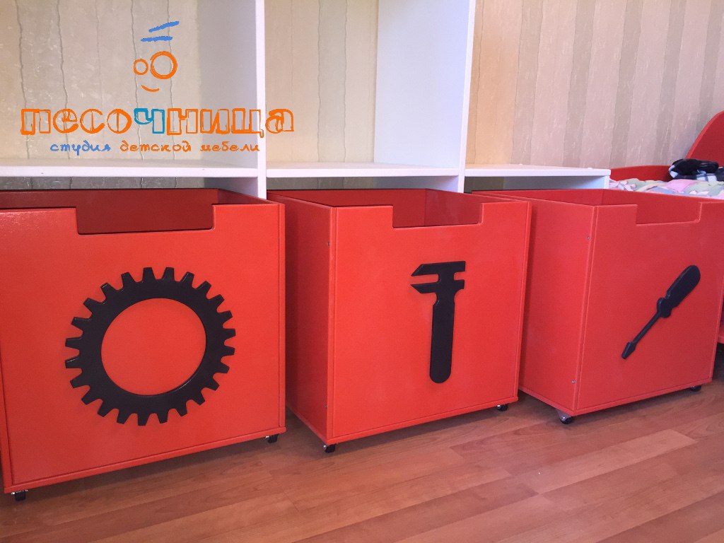 Деревянные ящики — вдоль стен или под столом. Их можно приобрести или сделать самим, только стоит ошкурить и окрасить, чтобы малыш не занозил руку. И неплохо бы дополнить такие ящики надежными колесиками — тогда они смогут сопровождать ребенка по всей игровой площади.