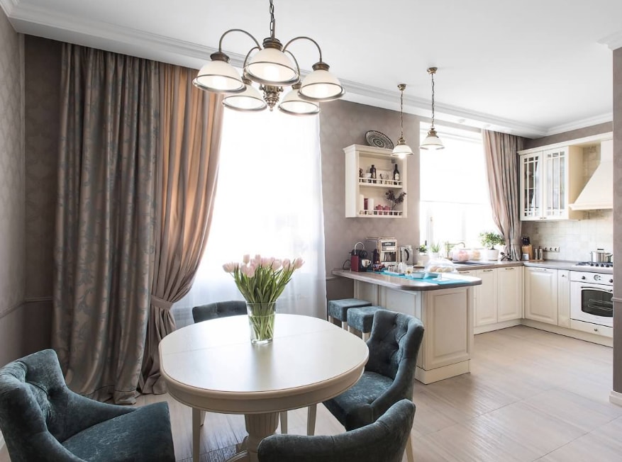 6.Шторы – легкий тюль, струящиеся кисеи или плотный занавес отделят кухню от гостиной, не отягощая интерьер.