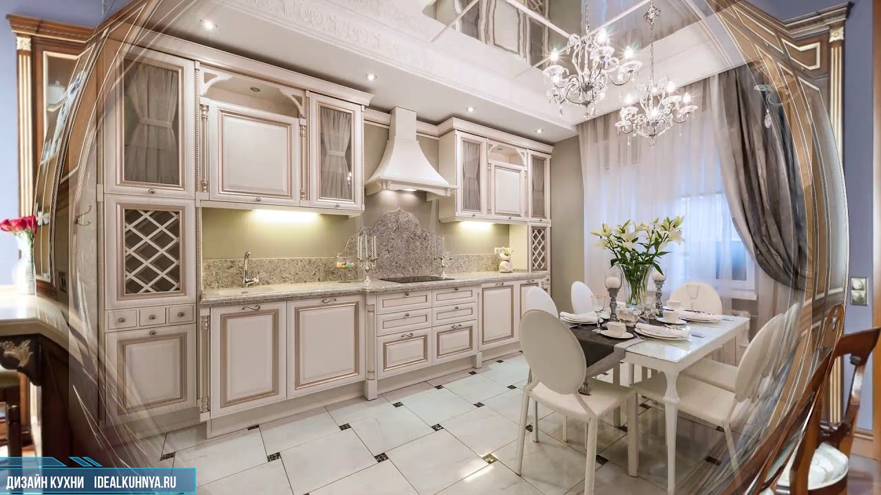Представьте, будто бы в классической кухне, совмещенной с гостиной. Теперь вы ассиметрично растягиваете двери и мебель, придав им изогнутых форм, добавляете витражей вместо стекла, оптических иллюзий на стены и потолок, делаете главенствующим сочетание белого и голубого цветов. Вы почти у цели!