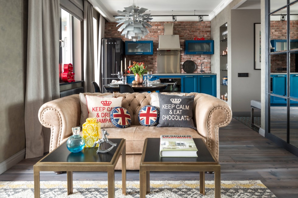 Светлая, белоснежная кухня-гостиная выглядит просто потрясающе. А объемный синий бархатный диван, как элемент визуального разделения, выглядит очень стильно и органично вписывается в общий дизайн. Это яркий пример того, что не стоит бояться экспериментов и непривычных решений.