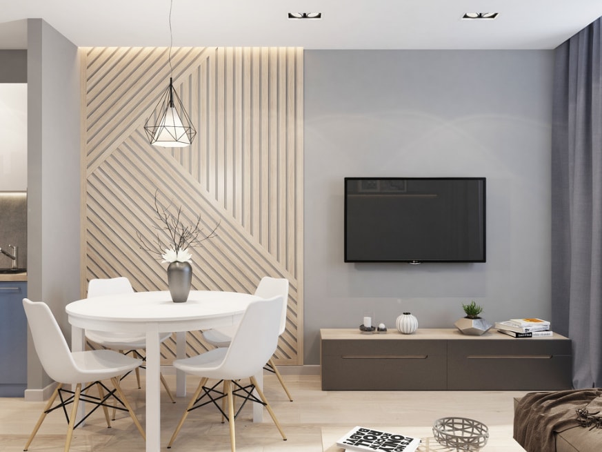 В комнатах небольших размеров столовую зону можно совместить с гостиной, свести к минимуму, заменив барной стойкой или вовсе исключить по ненадобности. Тут вы можете продолжить семейную традицию, организовав большой обеденный стол, или решиться на перемены в угоду простору.