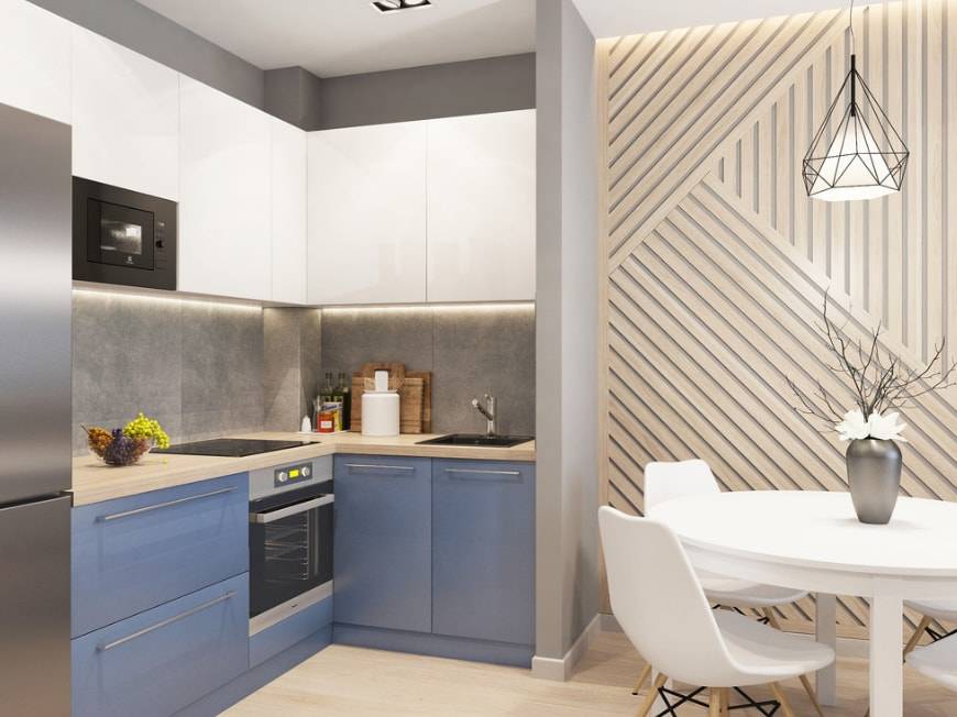 Если кухонная территория имеет скошенный угол, то правильным и единственным станет вариант линейного расположения гарнитура вдоль свободной стены, а обеденную точку помещают в скошенном углу.