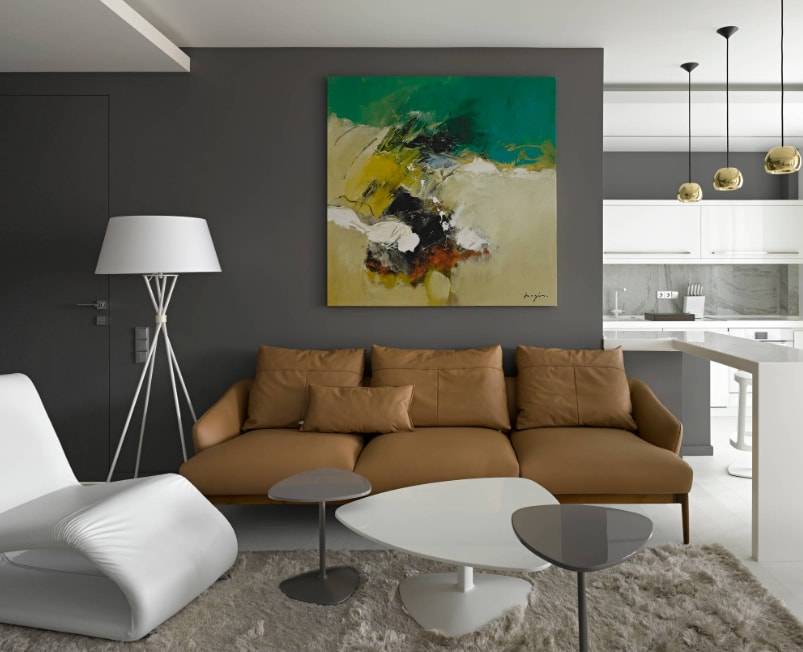 Не забывайте, что темные цвета – пожиратели пространства, их нужно применять в меньшинстве. Модным украшением гостевой зоны станет акцентная стена, роль которой выполнит и разделяющая перегородка.