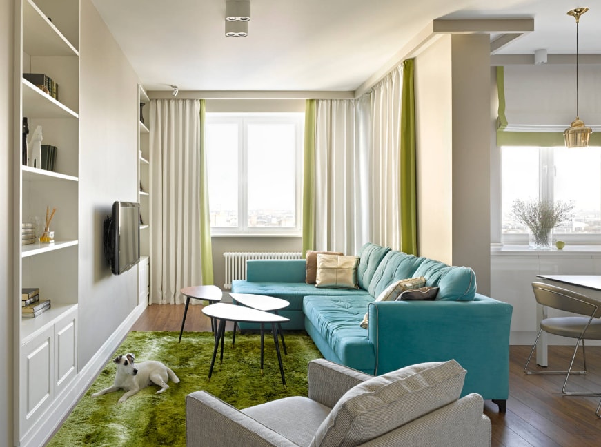- в зоне углового гарнитура можно разместить круглый стол, который смягчит графичность мебели.